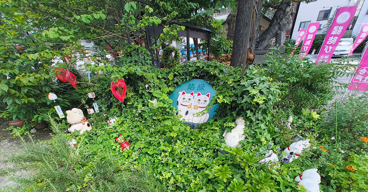 境内には、夫婦の招き猫の像が祀られており、これを撫でたり、写真を撮って待ち受けに設定すると願いが叶うと言われています。