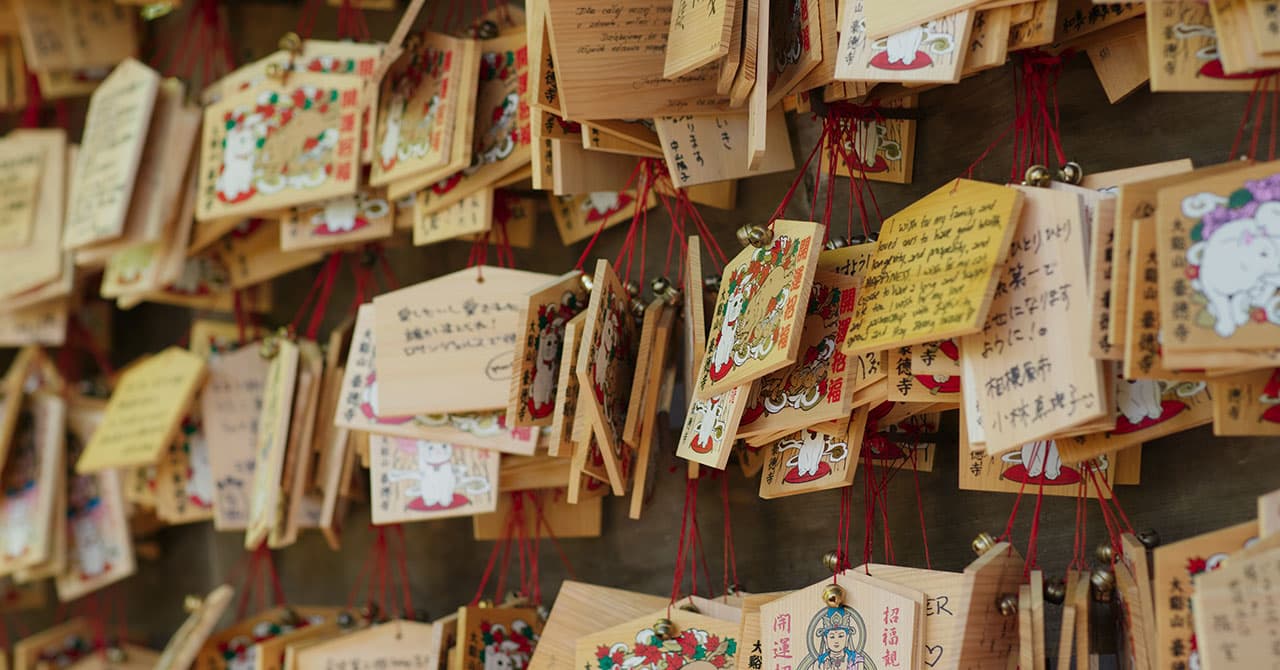 飾られているたくさんの絵馬を見ると、英語や中国語、韓国語など外国語で書かれた願いがとても多いです。その中には「Neco God」という文字!